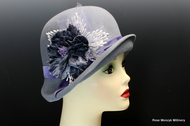 Bea is a charming lavender-gray wool felt cloche. She will help cure the doldrums of winter with her deep lavender velvet ribbon band. A velvet flower is accented with a background of Alencon lace and tufts of lavender tulle. She is lined.
