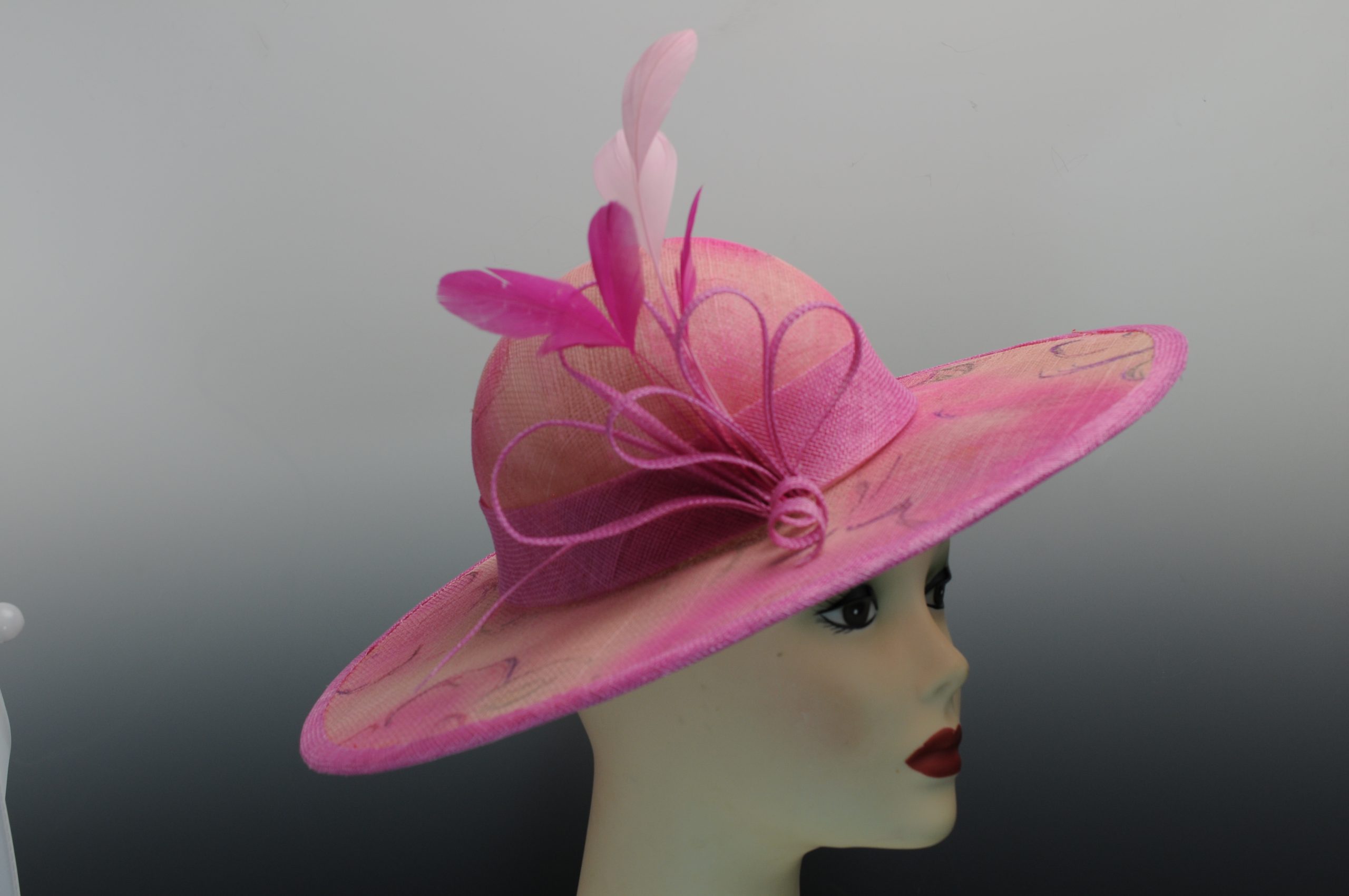 Cynthia is a striking hand-painted and hand-blocked pink and peach toned sinamay boater style hat. She has a pink sinamay bias edge and band. Sinamay loops and boots in light and bright pink complete the embellishment.