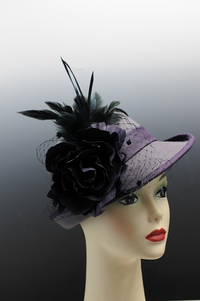 Karynn is fashioned in a very nice quality wool felt. She is blocked in a derby style with an upturned bak and tipped downward front brim. She has a purple pleather band and binding on her brim. A personally hand made purple rose adorns the side front. This is backed with black netting with chenille dots and black feathers. Lined.