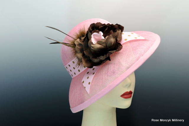 Molly is an adorable pink mushroom brim hat with brown accents. She has a pink bias edge and a cute pink with brown polka dots ribbon band. She also has a personally made brown fabric peony and brown feathers. Molly is very lightweight and easy to wear.