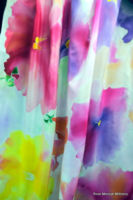 45 inch square hand-painted silk scarf. Each scarf is individually painted with a brush or sponge and dye. Hand rolled hem. Hand washable or dry clean.